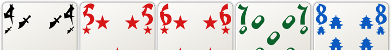 Notes: a) Sequence of pairs and straight are the only combinations whose number of cards is not specific. The leading player of the trick is the one who determines the number of cards that a sequence of pairs or a straight must have in order to be valid on the current trick. For example, if a leading player begins with 3-4-5-6-7-8 (straight), the rest of the players can strike him/her only with another 6-card straight of higher value, such as 5-6-7-8-9-10. A 7-card straight cannot be played during this trick. b) The value of the non-special cards increases from 2 to 10, J, Q, K, A. Ace has the highest value among the non-special cards and cannot be used in a straight before a 2.